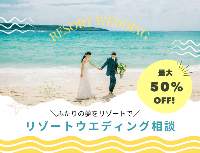 2025年9月末までにリゾート(沖縄・ハワイ・グアムなど)で結婚式を挙げられる方へ、挙式料最大50%OFF※特典利用対象には条件がございます。詳しくはスタッフまでお問い合わせください。