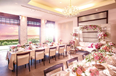 空と海とが一体となるように贅沢にデザインされた空間は、開放感にあふれています。優美なガラスタイルのバージンロードが、ハープの調べとともにしあわせへの祈りとなって包んでくれます。