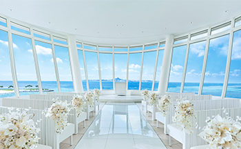真っ白なデザインにエメラルドグリーンの海が映えるデザイナーズチャペル