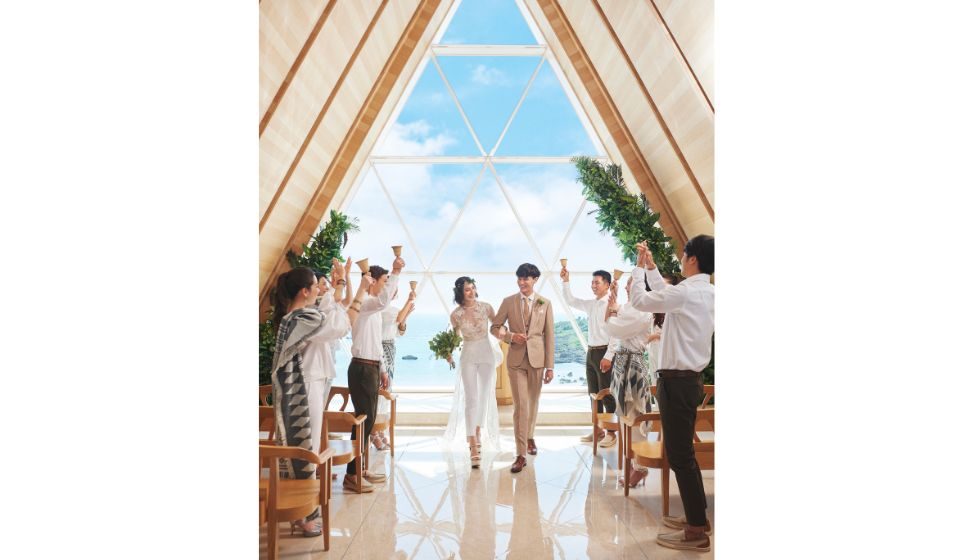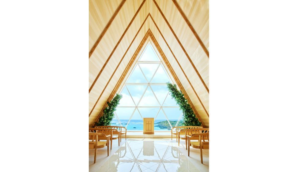 目の前の絶景に迎えられる、木目を基調とした温もりある空間の奏の教会で、宮古島の音色と自然美を胸に刻みながら感動に満たされるひとときを。