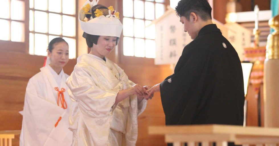 ウエディングドレスは前撮りでも着用しましたが、白無垢綿帽子や角隠しは式特有の雰囲気があり、自分自身も花嫁になるんだなと実感できるシーンでした。指輪交換の夢も神宮で叶えられました。